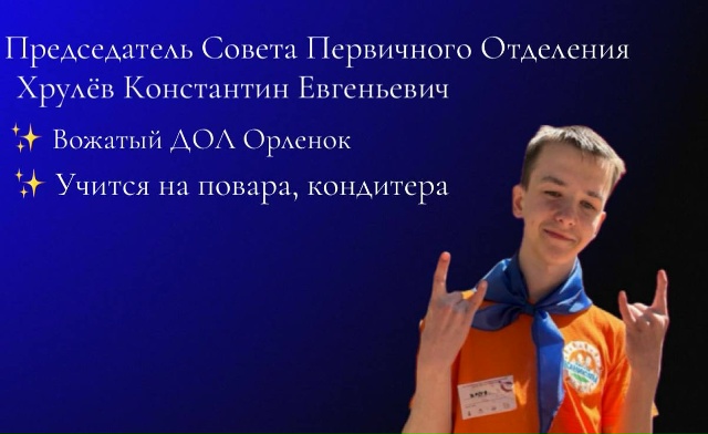 Знакомим вас с нашим Советом Первичного отделения! 🍳 Встречайте — Константин Хрулёв, наш председатель! Учится на повара-кондитера и, честно говоря, у него уже сейчас всё получается просто ❤️🔥 ☀️ А летом Константин меняет фартук на галстук вожатого и едет в «Орлёнок» — работать с детьми, дарить тепло и зажигать огоньки в глазах✨ 🔥 Ответственный, творческий, креативный. Гордимся, что именно он — лицо нашего отделения!