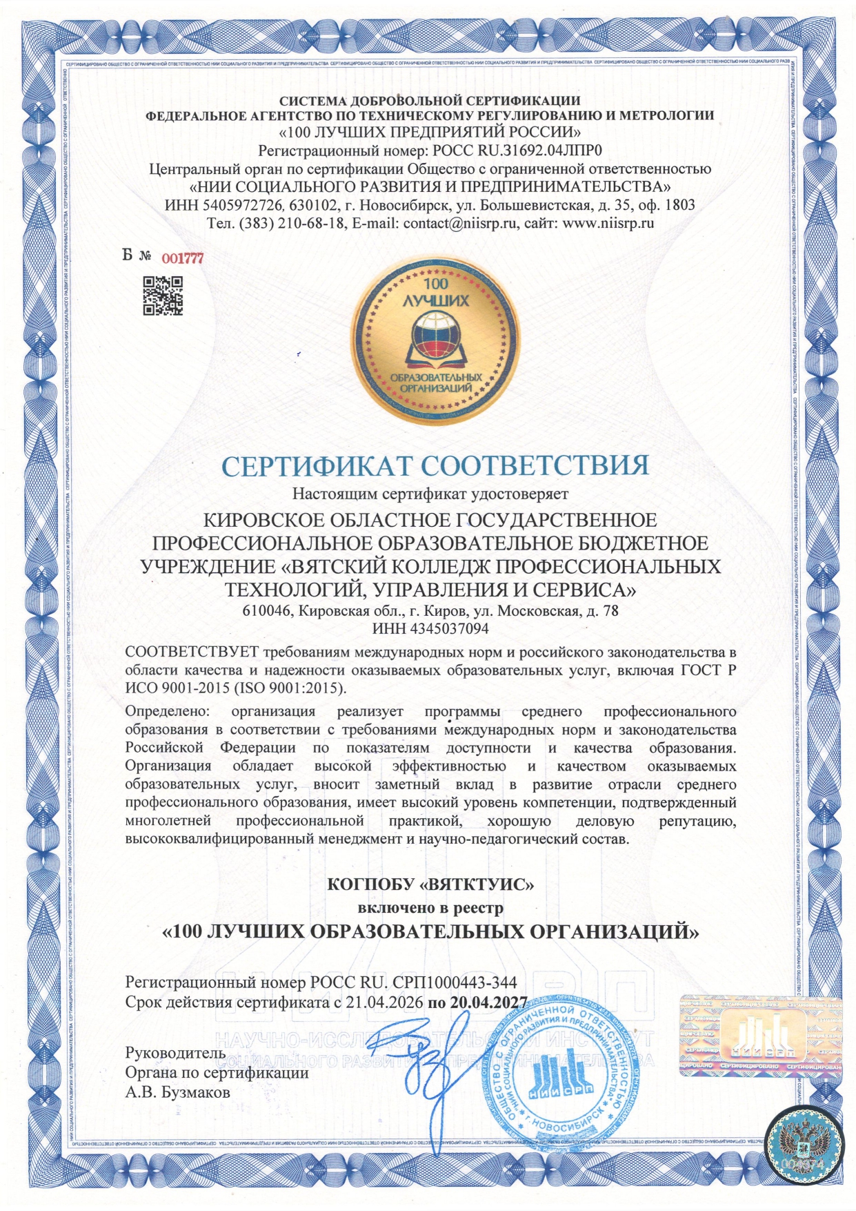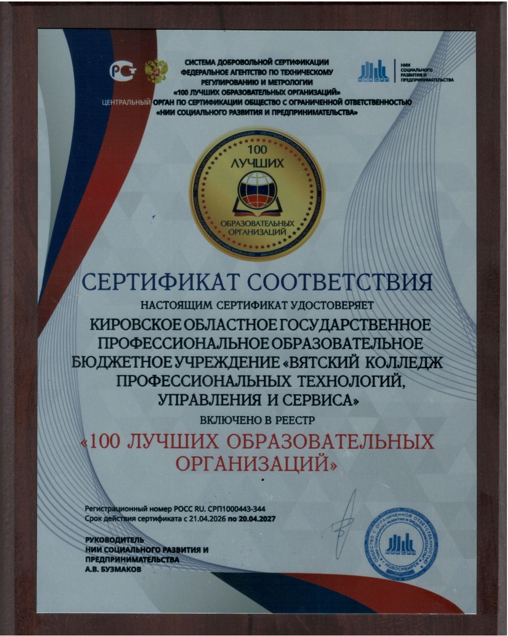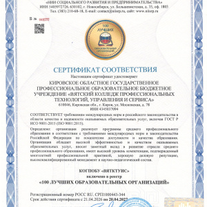 Сертификат выдан Федеральным агентством по техническому нормированию и метрологии совместно с Центральным органом по сертификации «НИИ развития и предпринимательства». Включение в реестр — это не только подтверждение соответствия международным стандартам и международным стандартам, но и вклад колледжа в развитие системы среднего профессионального образования.