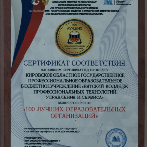 Наш колледж удостоен сертификата соответствия, подтверждающего включение в престижный реестр «100 лучших колледжей» страны. Это достижение свидетельствует о признании высокого качества образовательных услуг, эффективности управления и финансовой состоятельности преподавательского состава.