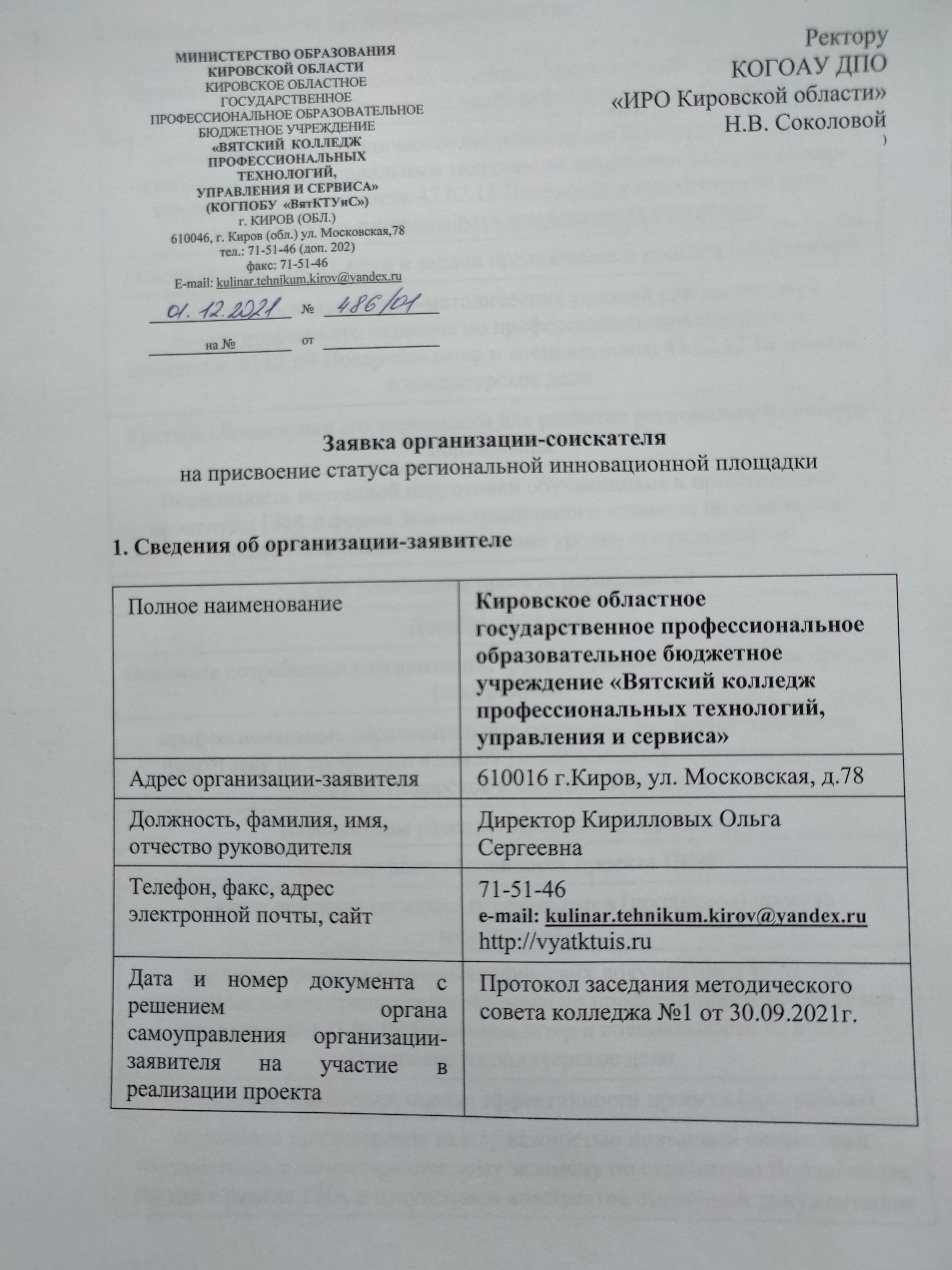 Заявка организации-соискателя на внесение требований региональной инновационной площадки