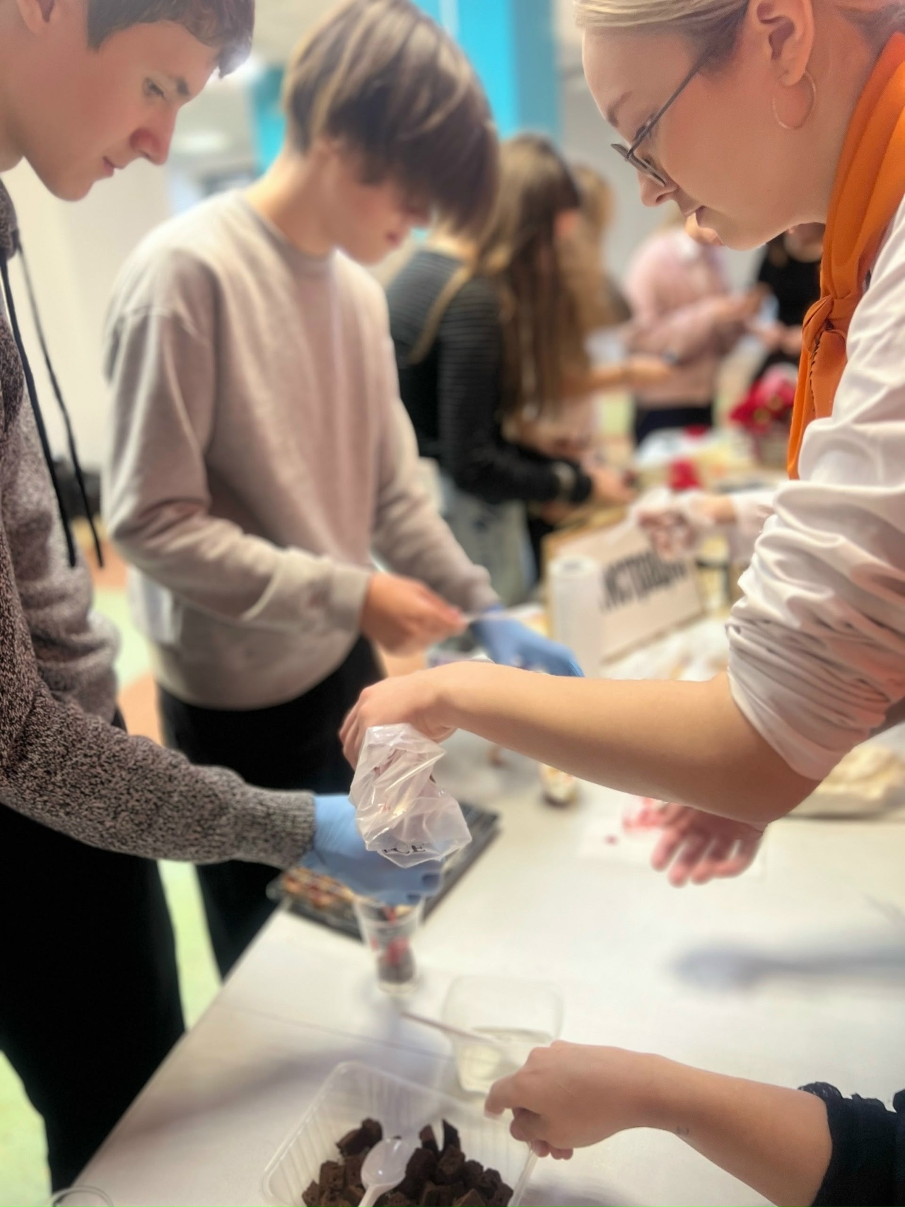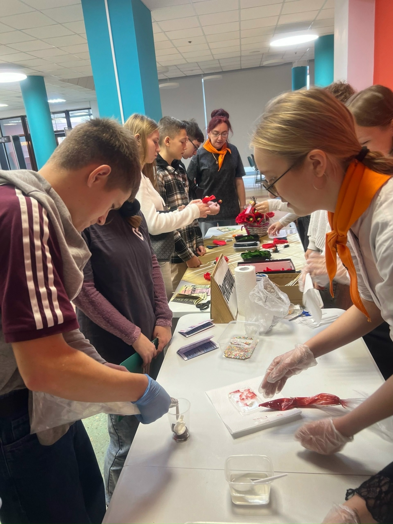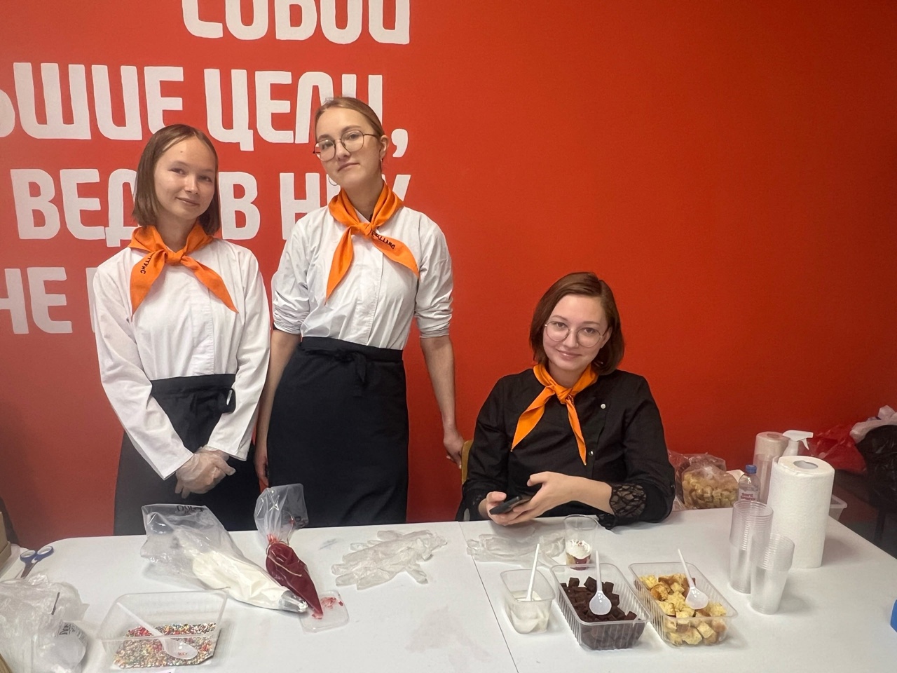 Рассказали школьникам про профессии общественного питания и торговли, провели два увлекательных мастер класса по приготовлению десерта "Трайфл" и изготовлению цветов из конфет.